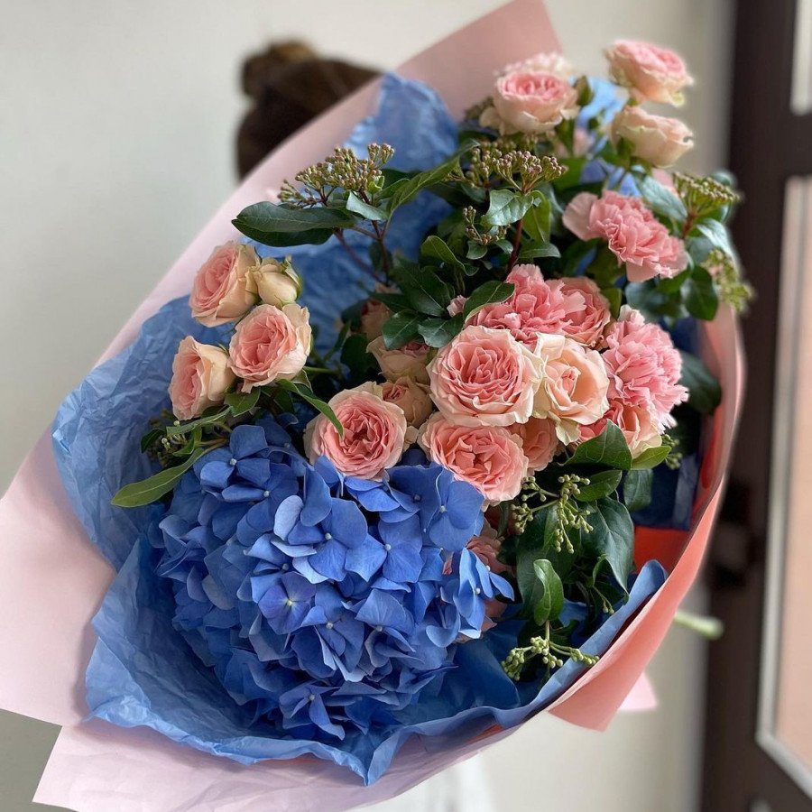 На фото голубая гортензия и пионовидные розы. В составе: гортензия 1 шт, кустовая пионовидная роза 6 шт, скиммия 2 шт, крафт-бумага 1 шт, атласная лента 1 шт, . Все цветы свежие и ароматные, букет красиво оформлен и отлично подходит для подарка. Доступна доставка цветов или самовывоз.